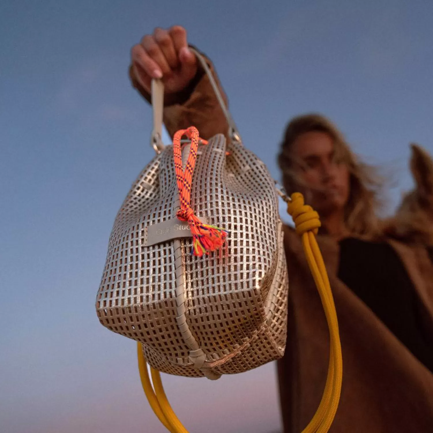 Le sac, léger et sécurisé grâce à sa fermeture coulissante avec un cordon d’escalade orange qui apporte du contraste, offre une variété de styles et une grande modularité avec ses deux bandoulières ajustables et sa poignée qui permettent un porté main, épaule long ou court, et crossbody. En effet, il est livré avec une bandoulière en chaîne or clair au look sophistiqué, une autre plus sporty en corde d’escalade jaune, et également une poignée en cuir crème.