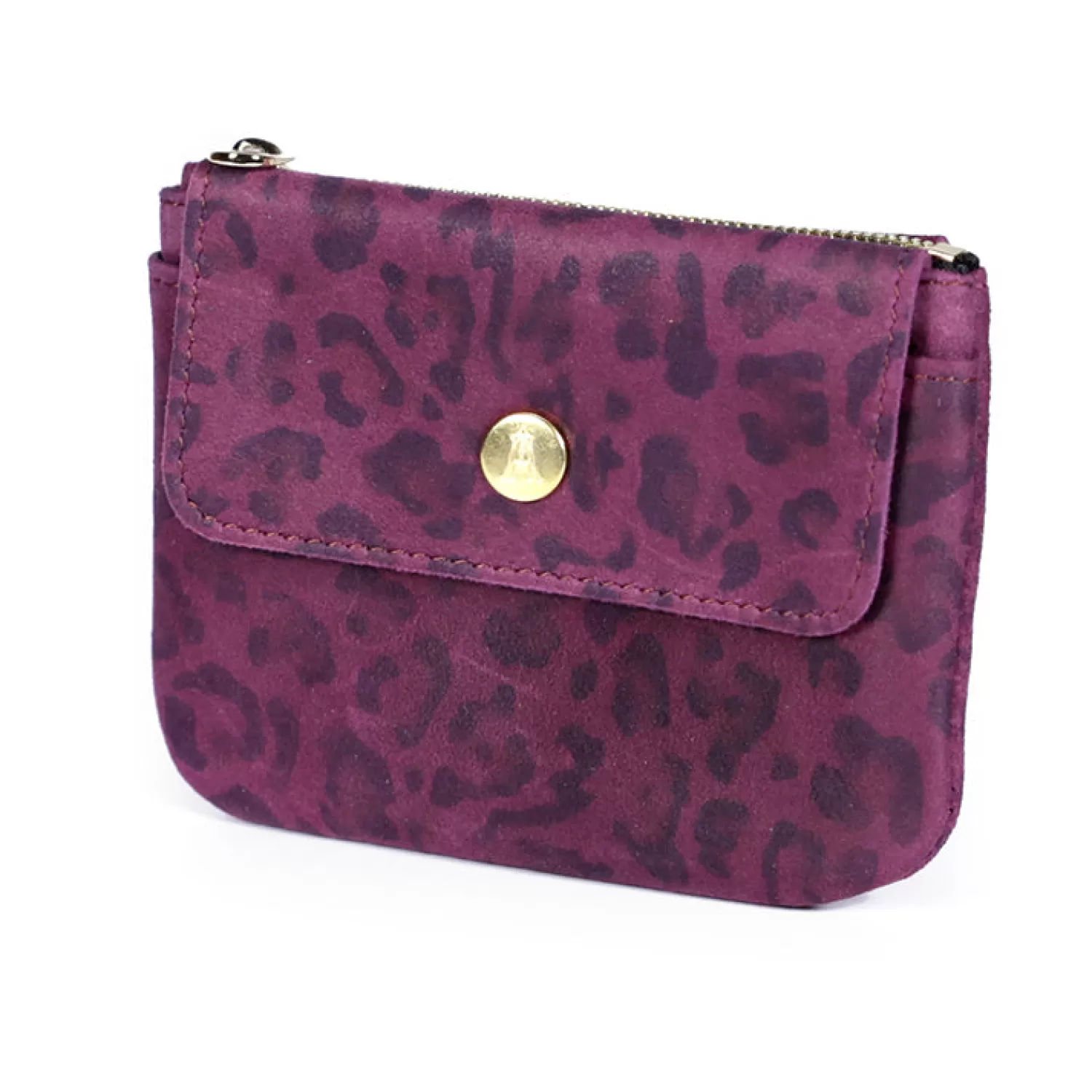 Le porte-monnaie Finance Léo Prune est le mini accessoire idéal pour allier style et pratique. Confectionné en cuir de chèvre velours violet imprimé avec un motif léopard audacieux, il se distingue par son look unique et tendance, facile à retrouver dans votre sac.