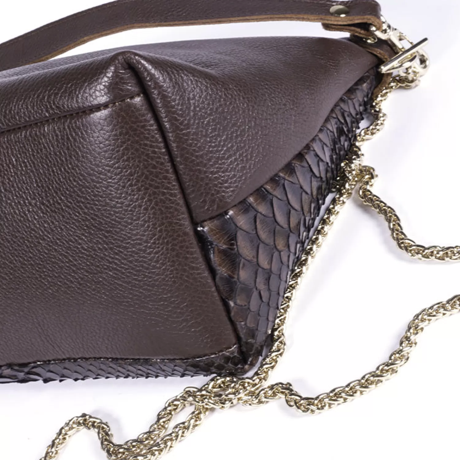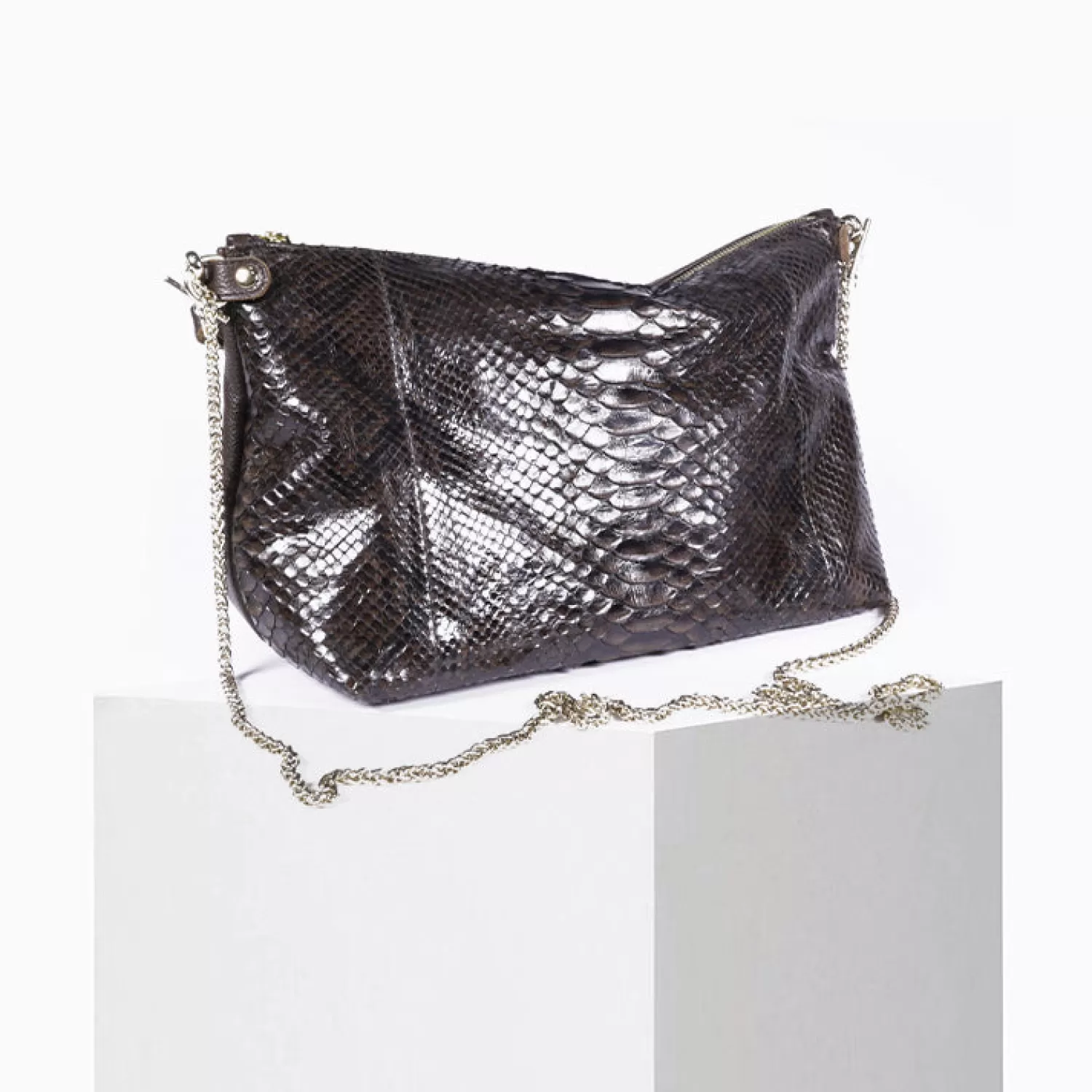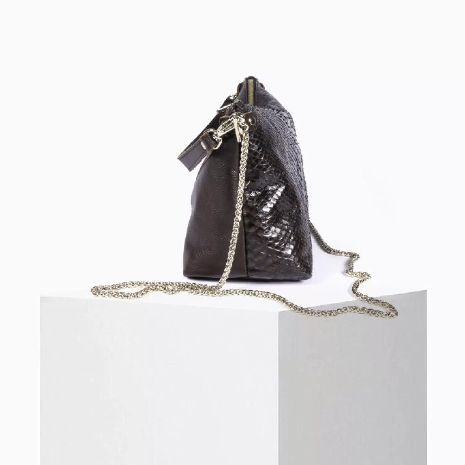 Mallow Python Choco, c’est le sac pochette moderne au volume parfait en cuir d’exception : le python.