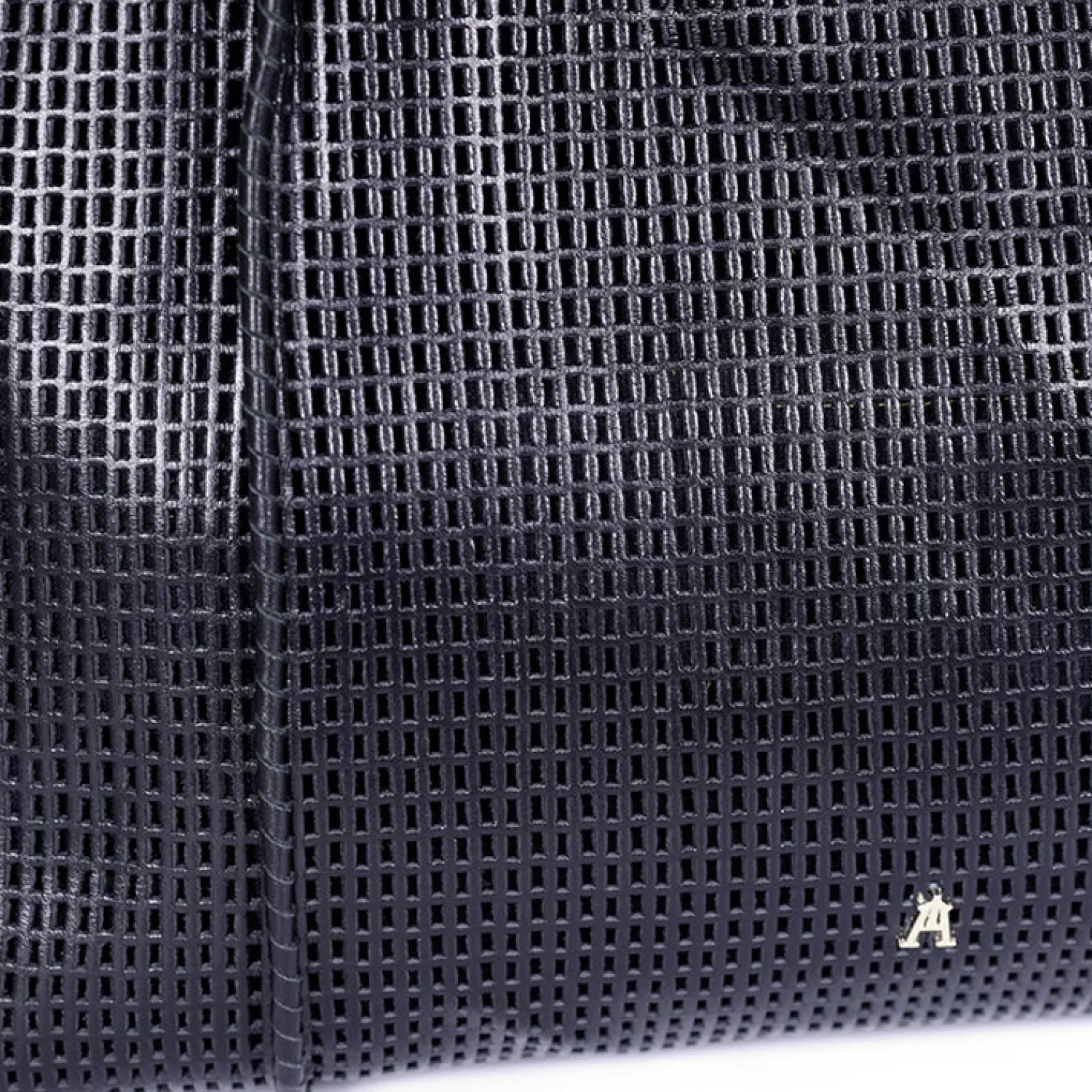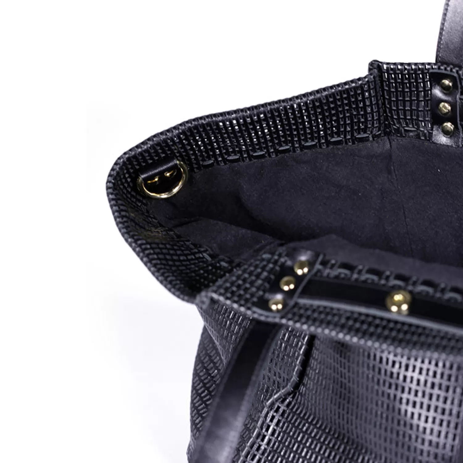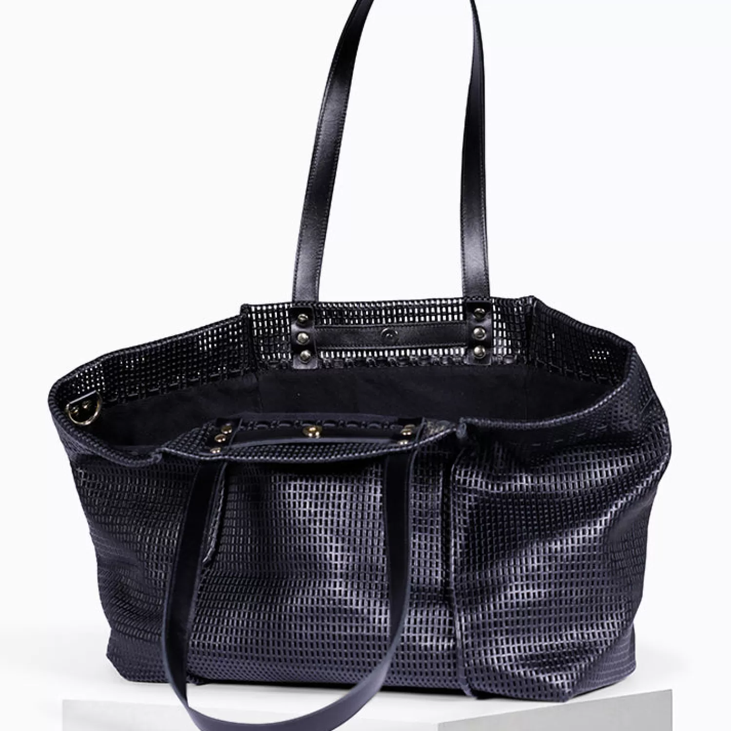 Confectionné en cuir de veau noir perforé, ce cabas se distingue par son allure moderne et sophistiquée. Il est construit avec 3 panneaux de cuir assemblé entièrement à la main grâce à un lien de cuir assorti. La doublure en coton bio et les poches intérieurs ajoutent une touche de praticité à ce cabas.