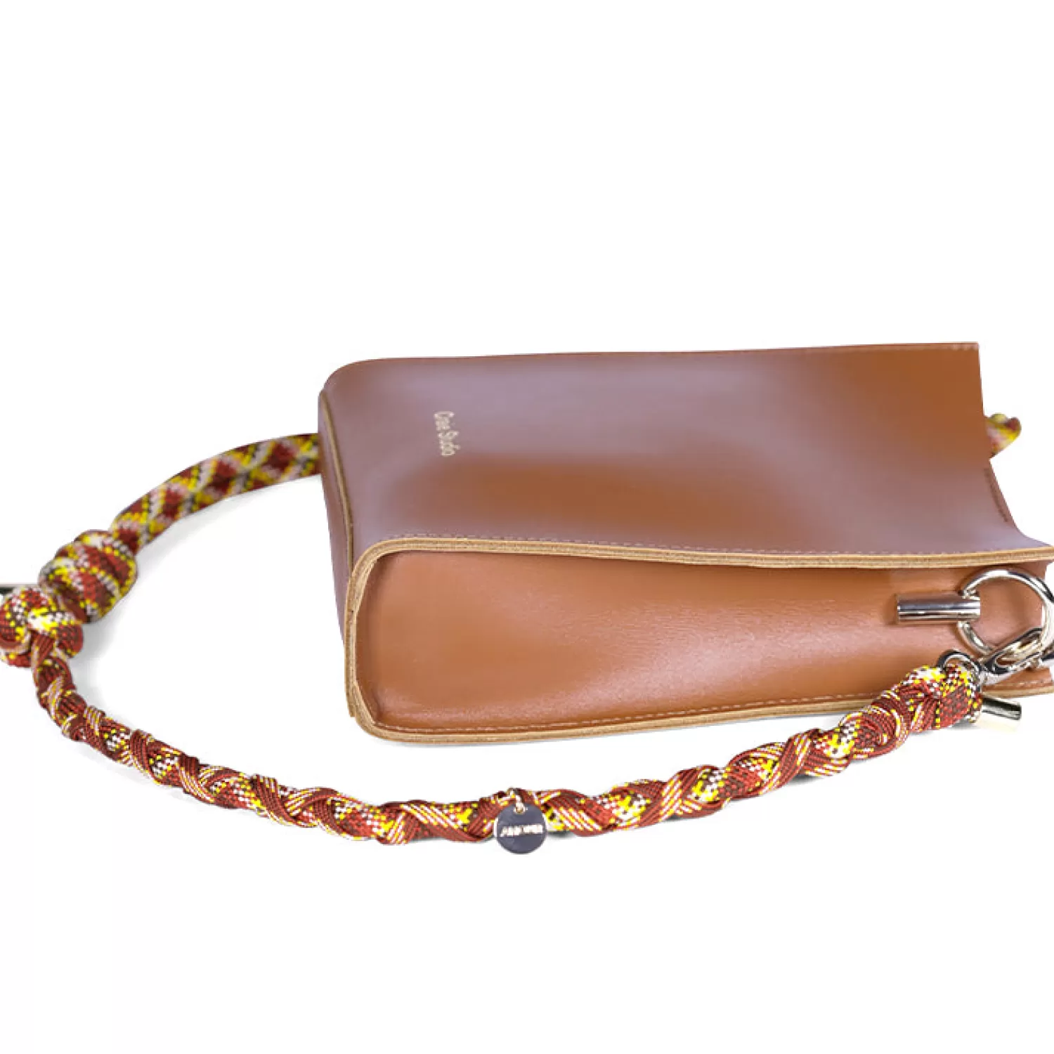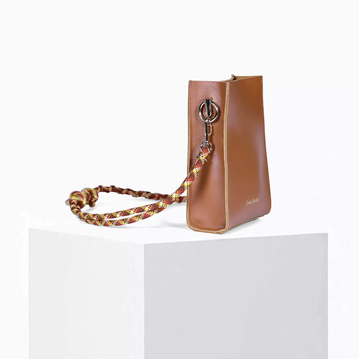 Le sac Essence en cuir Tan allie simplicité et élégance, avec sa bandoulière créative en mélange de corde d’escalade.