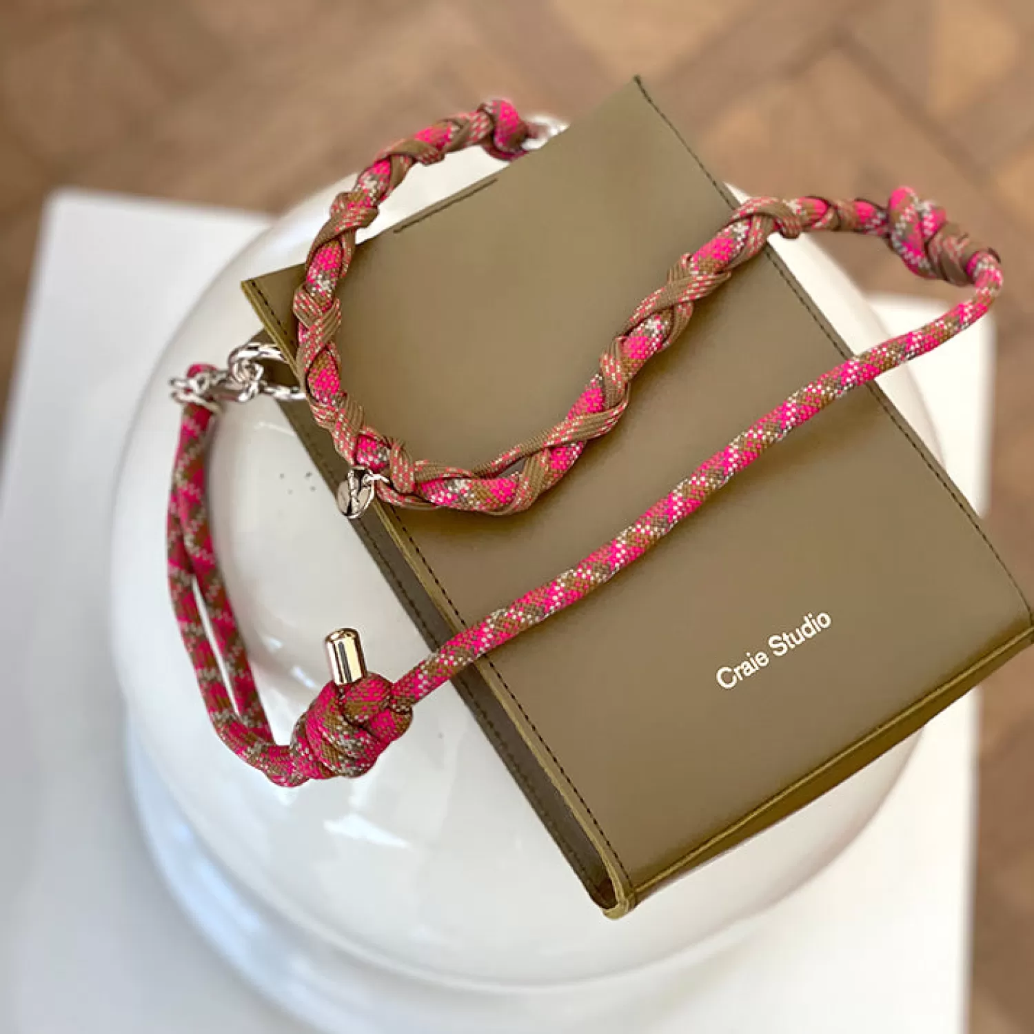 Il se distingue par sa bandoulière en mélange corde et cordon Square Marron, réglable grâce à un noeud coulissant.