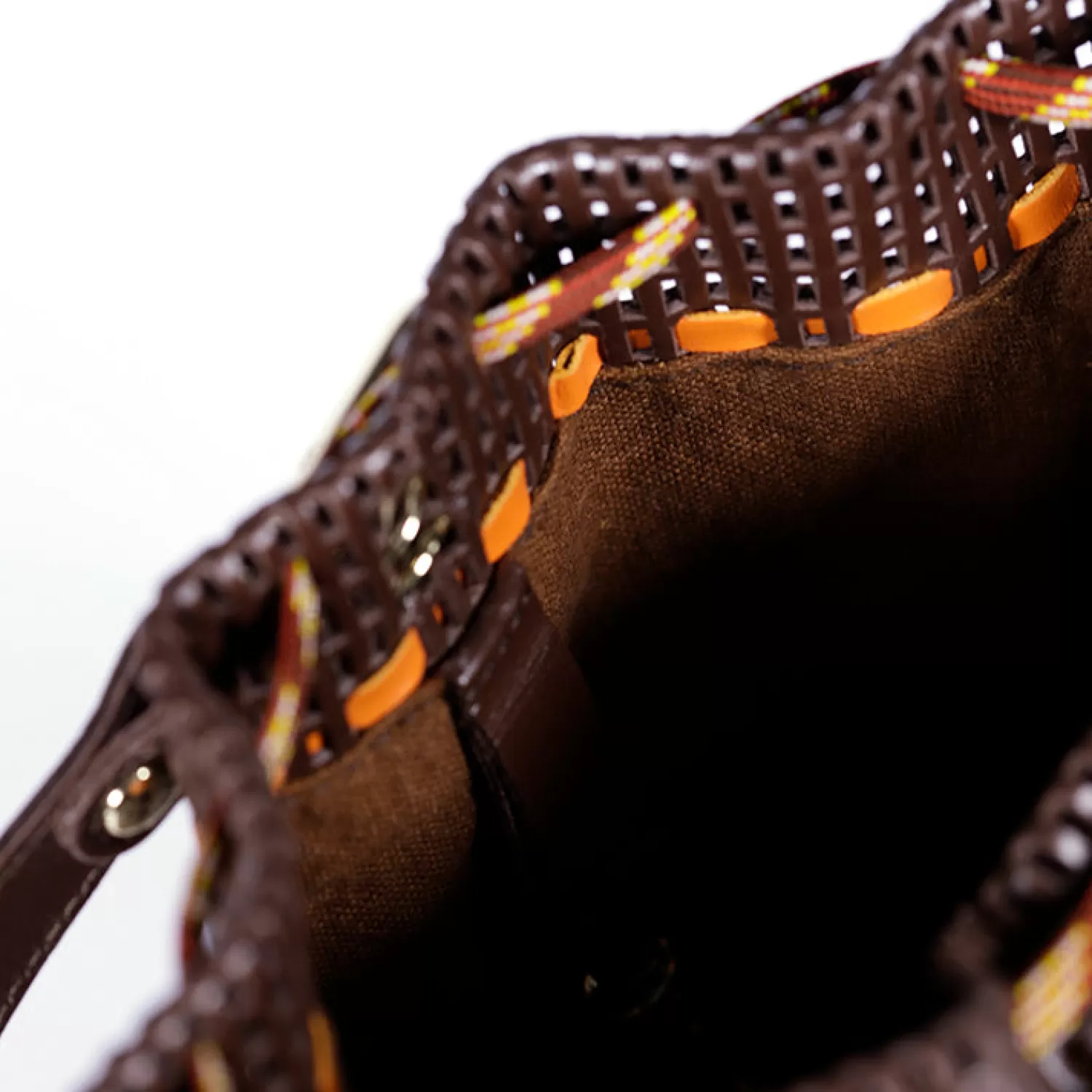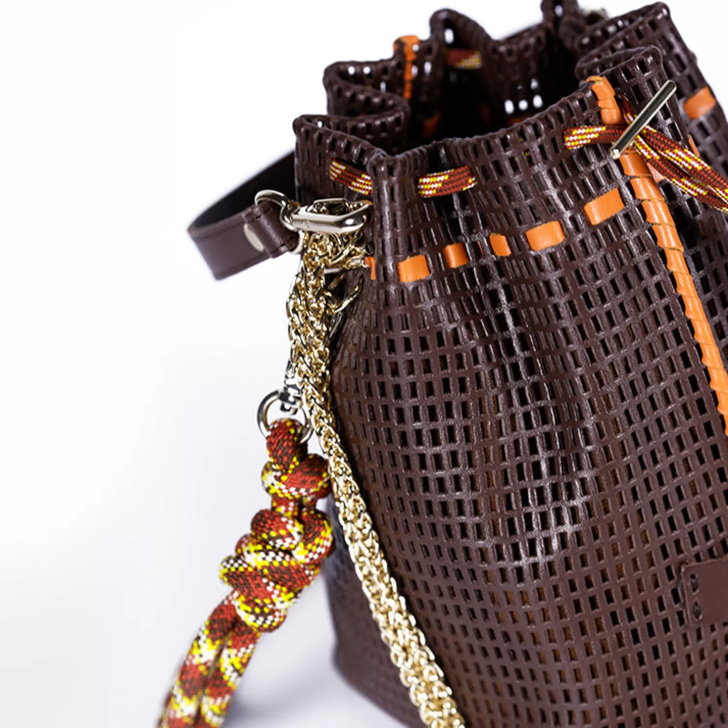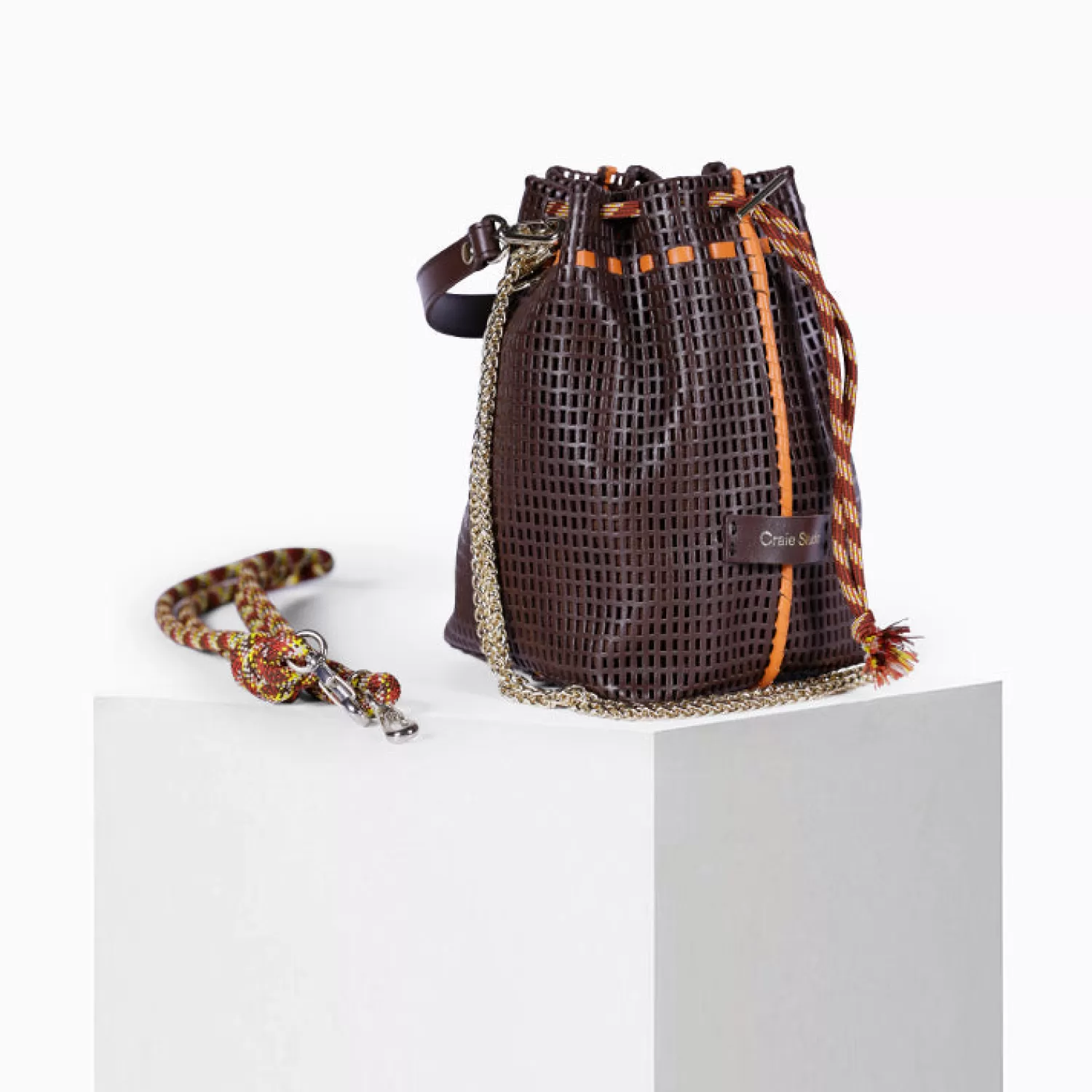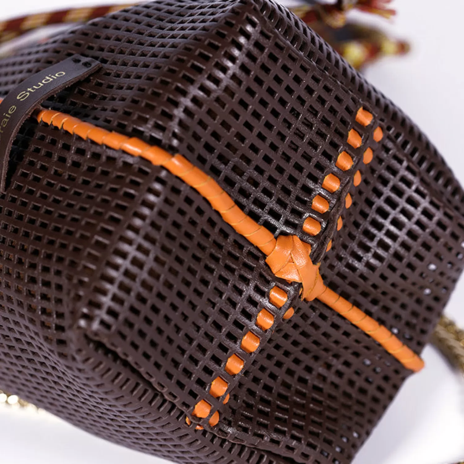 Créé à partir d’une seule pièce de cuir brun perforé, délicatement pliée et cousue à la main avec un lien de cuir orange, ce sac offre un rendu sac bourse souple et aérien. Il est doublé de coton bio marron.
