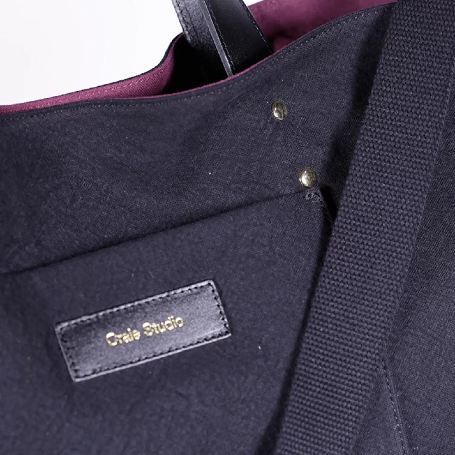Notre toile de coton bio et résistante, est tissé dans les Vosges. La face du sac est en toile noir mais il peux aussi se retourner l’envers est violet.