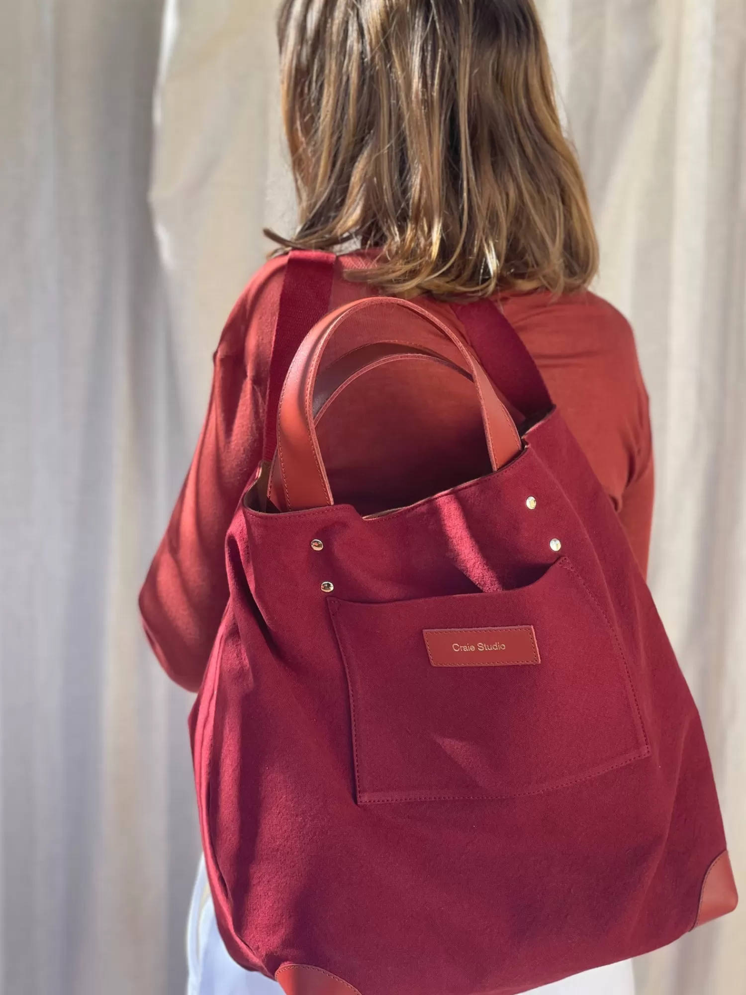 Notre toile de coton,bio et résistante, est tissé dans les Vosges. La face du sac est en toile vert kaki, mais il peux aussi se retourner l’envers est marron.