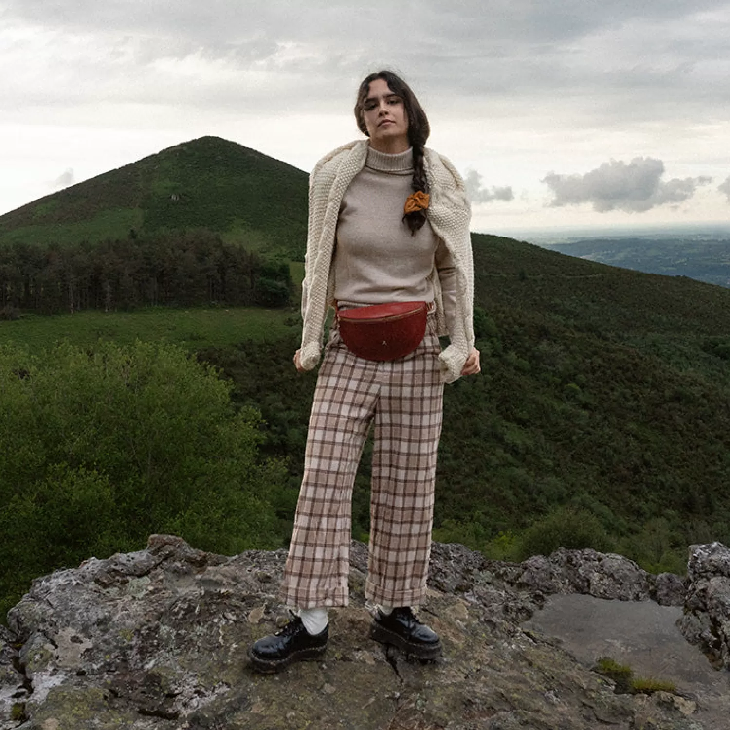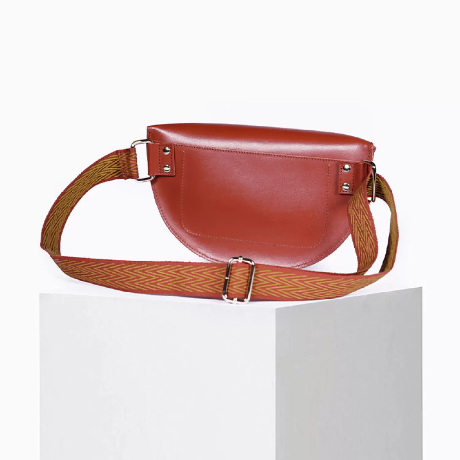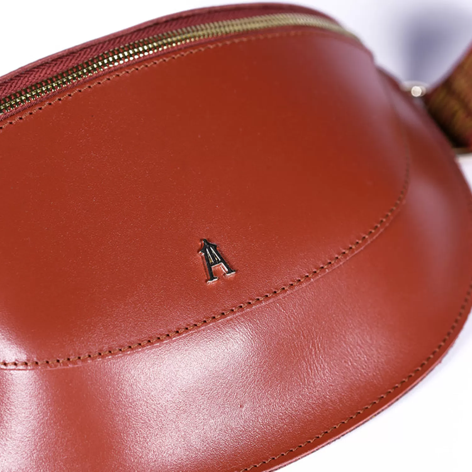 La banane Smile Terracotta est la belt bag Craie Studio revisité tout en courbe, réalisée dans un cuir de vachette bordeaux clair épais et résistant pour un rendu graphique.