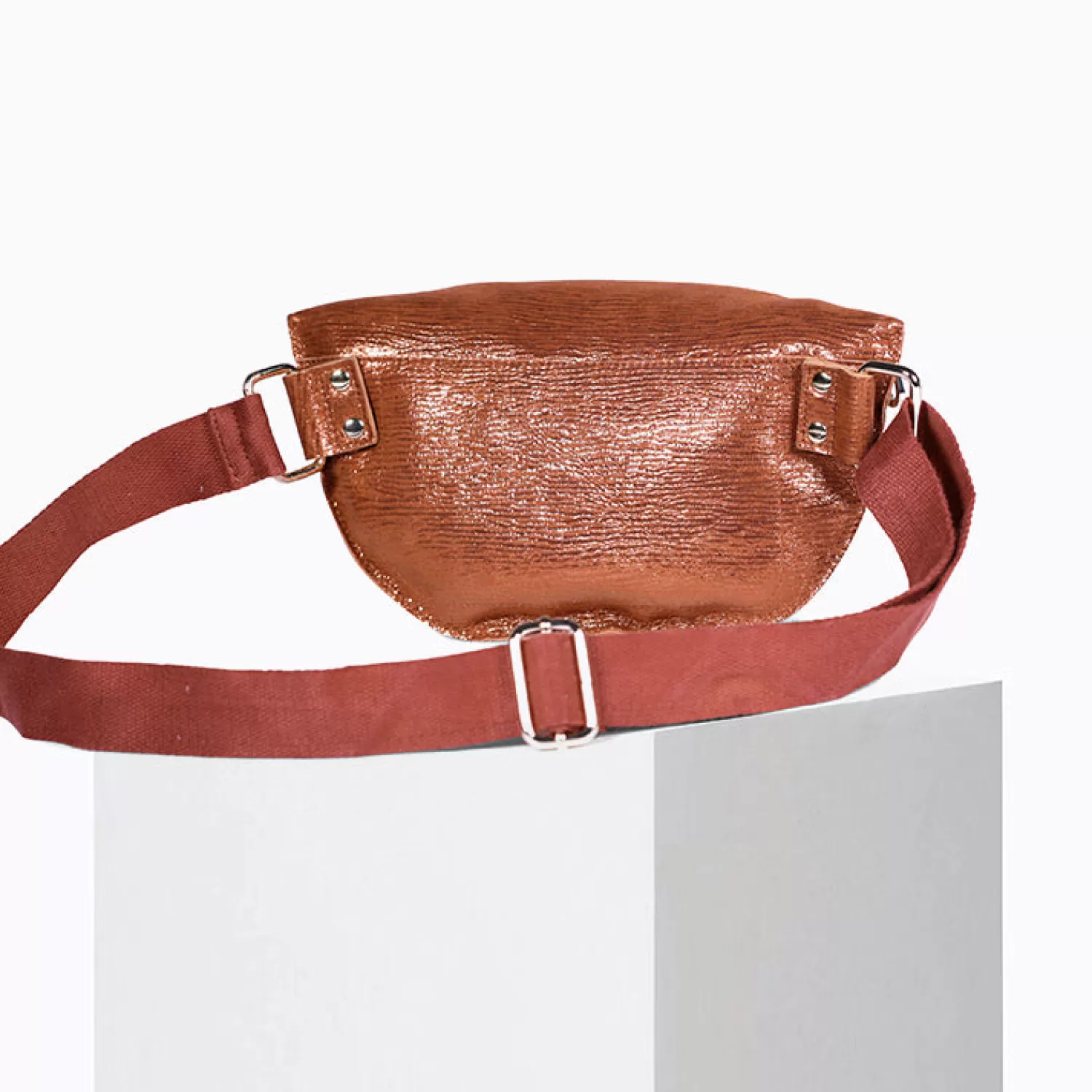 La banane Smile Cooper est la belt bag Craie Studio revisité tout en courbe, réalisée dans un cuir d’agneau hyper souple pour un rendu destructuré. Ce cuir d’agneau rouille est métallisé en surface de petites paillettes laiton orange.