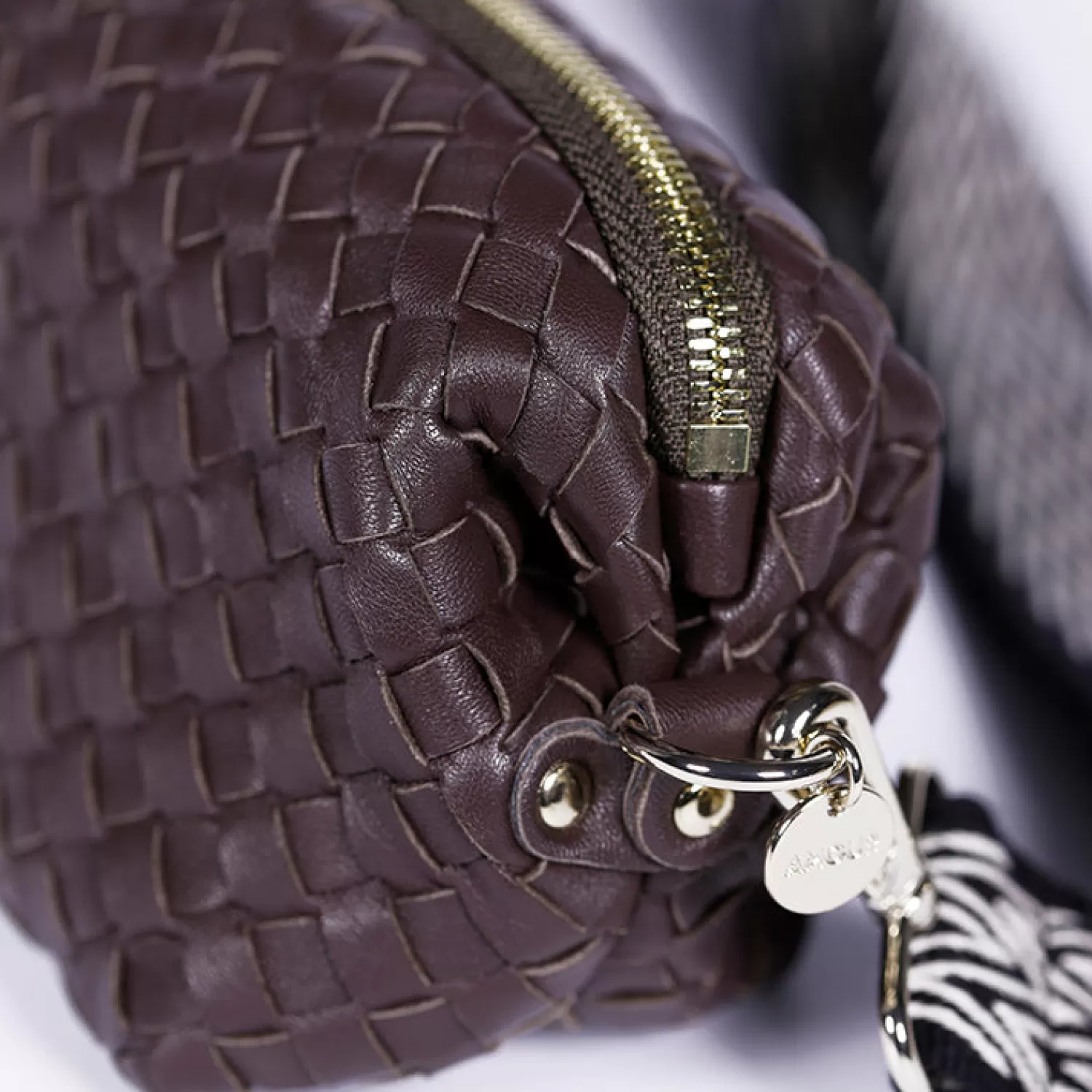 La pochette Nuage Tressé Brownie est un petit sac en cuir tressé ultra modulable vendu avec 2 bandoulières.