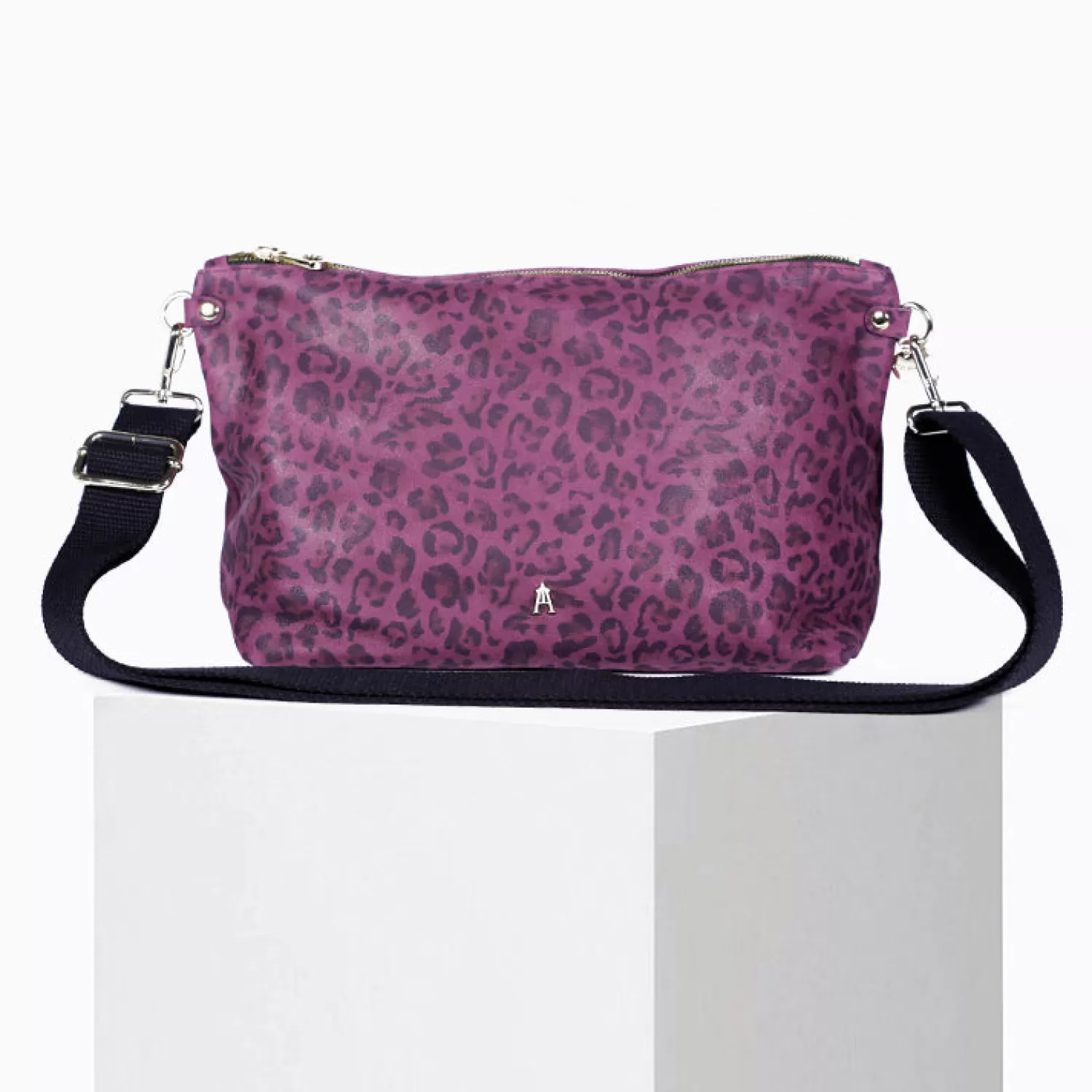 Mallow Léo Prune, c’est le sac pochette moderne au volume parfait. Il est pensé dans un beau cuir de chèvre velours violet imprimé d’un joli motif léopard en nuance de noir.