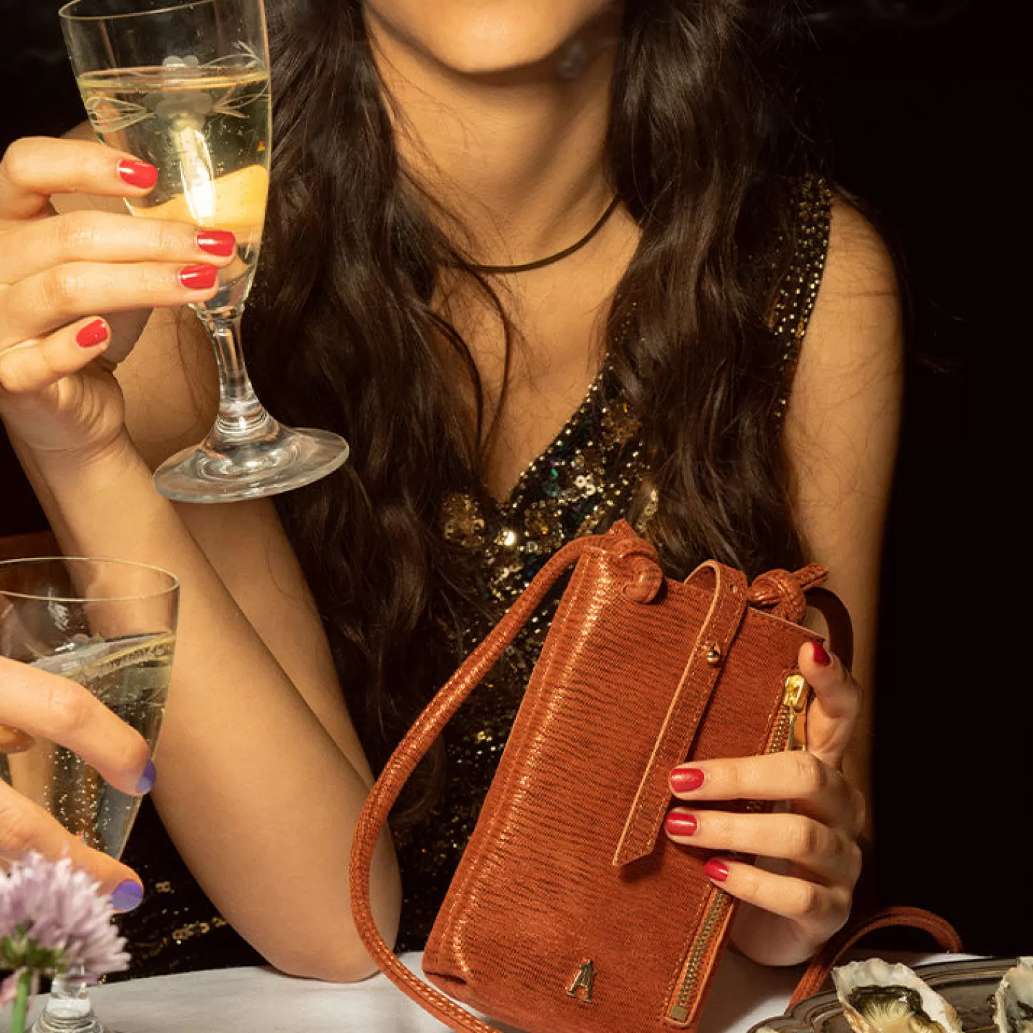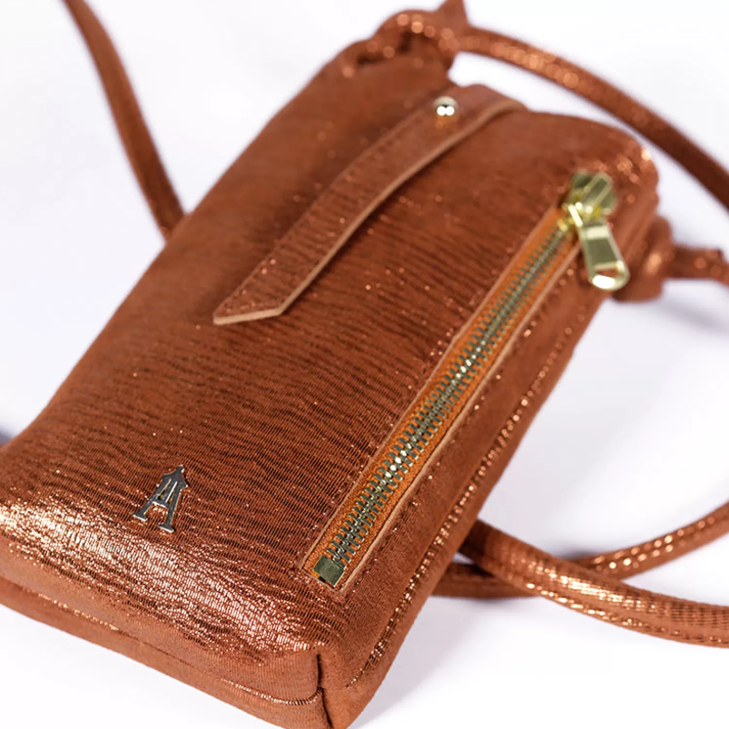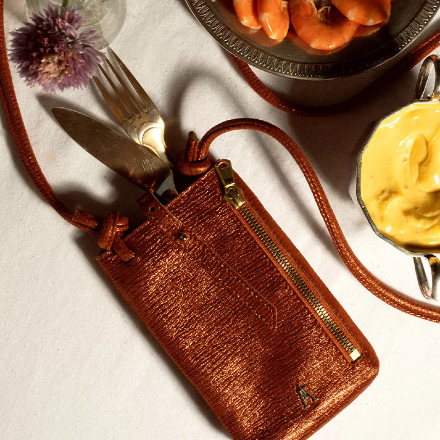 Léger et pratique avec ses compartiments à cartes au dos et sa poche zippée, on l’adore dans notre cuir Cooper : un agneau orange métallisé de paillettes laiton.