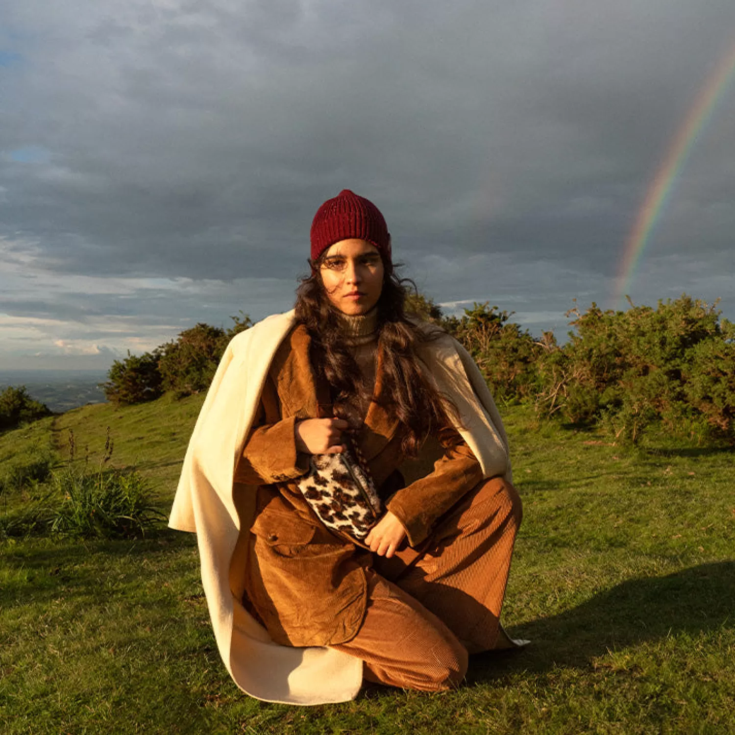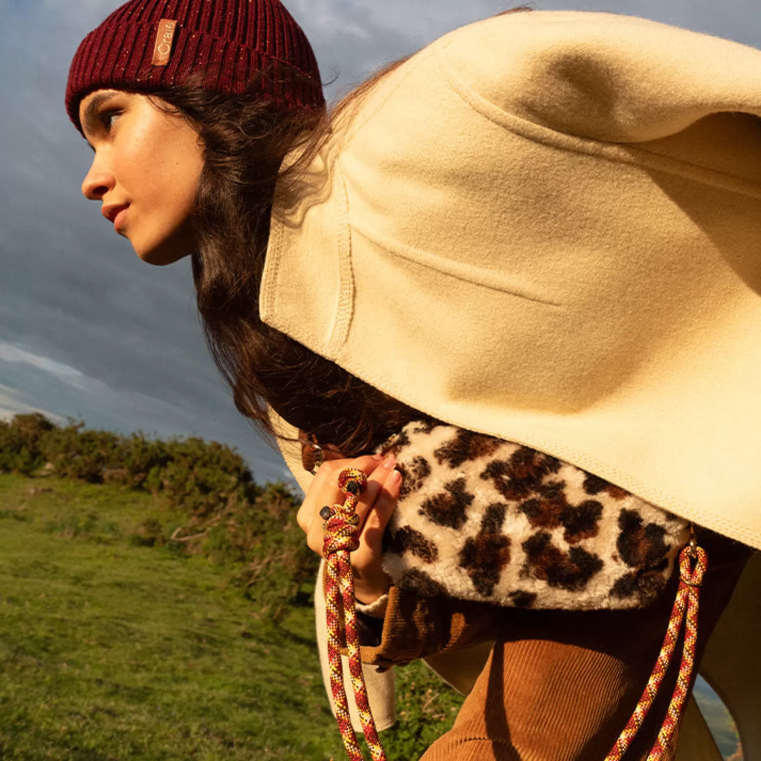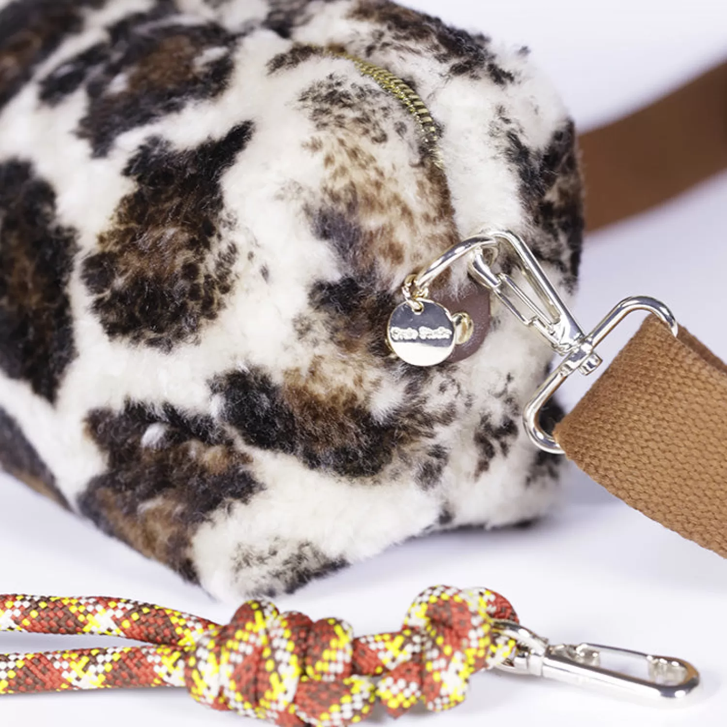 La Pochette Nuage Laine Léopard est livrée avec deux bandoulières : une en corde d’escalade Square Marron pour un look fashion, et une sangle en coton camel confortable.