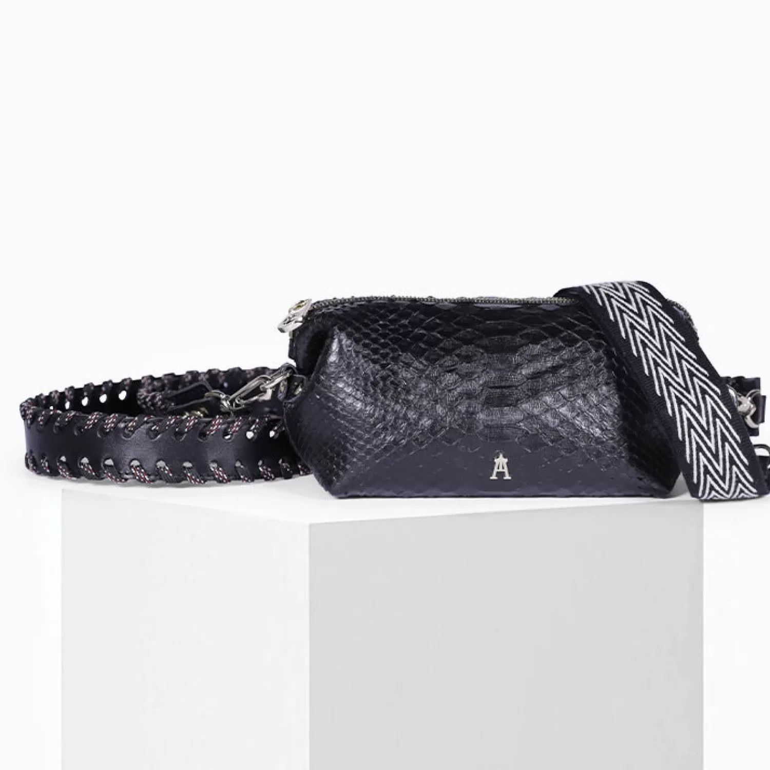 La Pochette Nuage Python Noir est livrée avec deux bandoulières : une en cuir décoré d’un cordon tressé à la main, et une sangle en coton contrasté noir&blanc confortable.