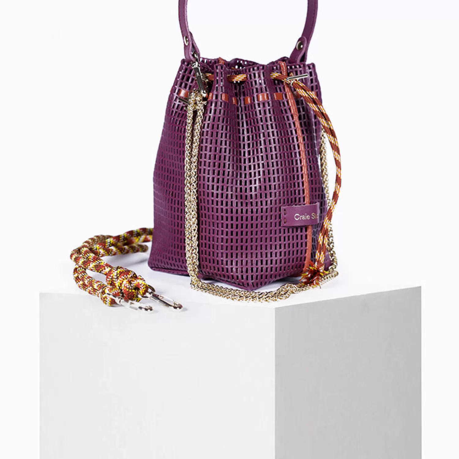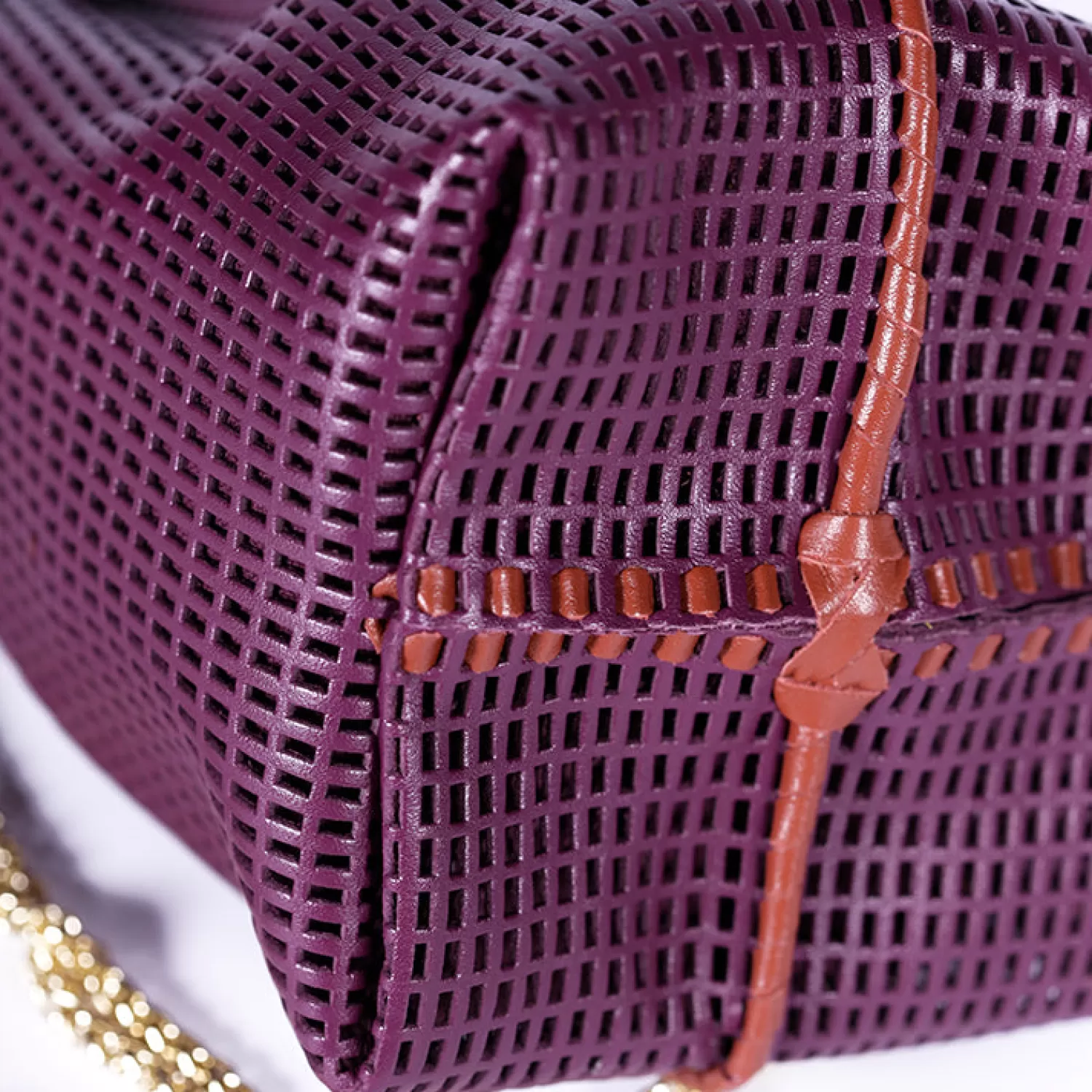 Créé à partir d’une seule pièce de cuir violet perforé, délicatement pliée et cousue à la main avec un lien de cuir bordeaux, ce sac offre un rendu sac bourse souple et aérien. Il est doublé de coton bio violet.
